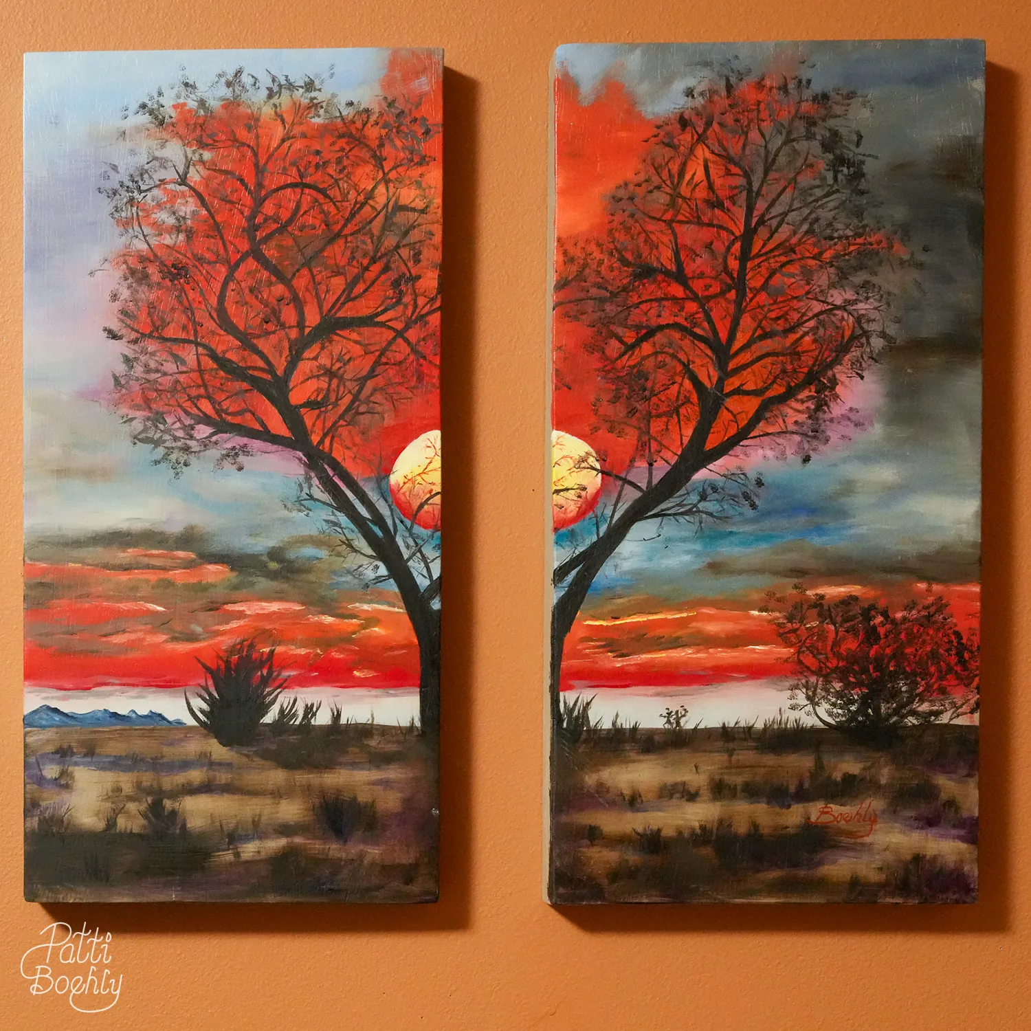 “Heartfire” is a two-piece painting of a heart-shaped tree with an orange sky at sunset. The rolling fields with mountains in the distance make it a very peaceful painting. The style is impressionism and the bright colors capture the essence.